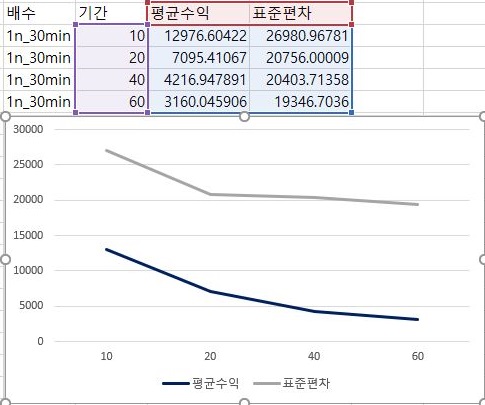 그리고 나서 다음으로는 이익의 최대치와 손해의 최고치를 비교해 보았습니다만, 이게 60기간에서 손해는 확실히 최고로 증가가 되었고, 이익의 최대치는 변화가 없다가 마지막에 가서야 증가를 하는 것을 볼 수 있었습니다. 다만 여기까지 했는 것으로는 100% 확신을 할 수 없기 때문에, 일단 다른 조건에서 한번 더 확인을 해 보아야 할 필요성이 있습니다.