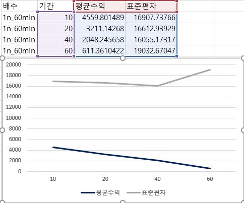 어떻게 하다보니 스크린샷이 빠지게 되었는데, 일단 다음은 1번 조건을 60분봉 캔들 챠트 데이터 베이스를 바탕으로 계산해서 얻은 결과의 평균수익과 표준편차를 계산해 보았습니다. 여기서도 역시나 평균수익은 RSI를 계산하는 데 들어간 기간이 길어지면 길어질 수록 감소하고, 표준편차는 여기서는 잡지 못 했습니다.