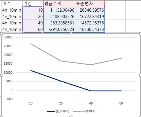 다음으로는 30분봉 캔들챠트를 사용해서 얻은 결과를 가지고서 나온 데이터를 바탕으로 먼저 표준편차와 평균수익을 비교했더니, 거의 RSI 계산에 필요한 기간이 10인 경우만 쓸만하다는 결론이 나왔습니다.