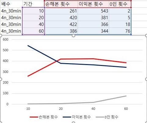 이번에는 계산결과 나왔는 최대한의 이익과 손해에 대해서 이야기를 해 보고자 합니다. 중간에 조금 이상한 경향을 하나 보이기는 하지만, 계산에 필요한 기간이 길어지면 길어질 수록, 손해는 더 커지고, 이익은 더 줄어드는 경향을 보이고 있습니다.