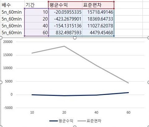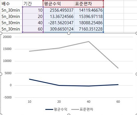 그리고 60분봉에서 얻은 데이터로 한번 비교분석을 평균수익과 표준편차를 보았는데, 상황이 심각하게 않좋은 것을 볼 수 있습니다.