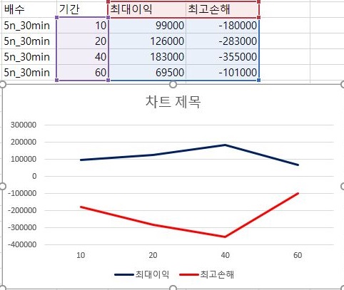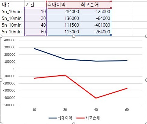 다음으로는 이익의 최대치와 손해의 최고치를 비교해 보았습니다. 특이하게도 40기간에서는 이익이 커지면서 손해도 커지는 경향을 확인했습니다. 그 외에는 특별한 경향이 보이지는 않습니다.