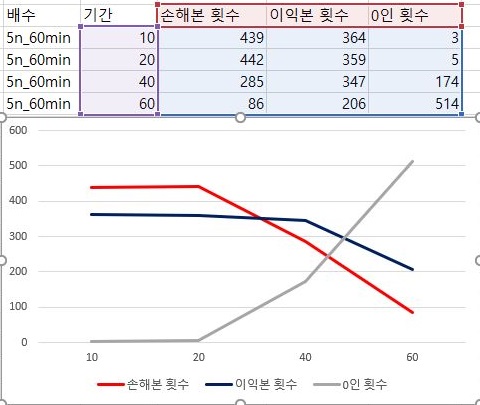 그리고 나서 위 스크린샷에서 보이는 것처럼 손해를 본 경우의 수와 이익을 본 경우의 수를 보면, 10기간 빼고는 거의 쓸모가 없으며 - 손해가 이익보다 더 많은 종목에서 나오며, 역전이 되는 마지막 조건에서는 거래가 없는 0인 경우가 엄청나게 증가했습니다.