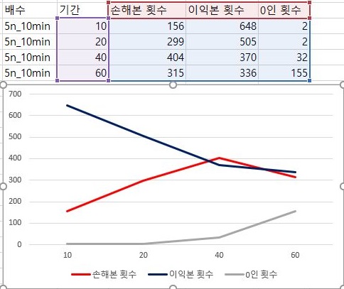 그리고 나서 위 스크린샷에서 볼 수 있듯이 손해를 본 횟수가 처음부터 이익을 본 횟수보다 더 많으며, 20기간 넘어서는 거래량이 전혀 없는 0인 경우가 점점 더 많아진다는 것을 알 수 있었습니다.