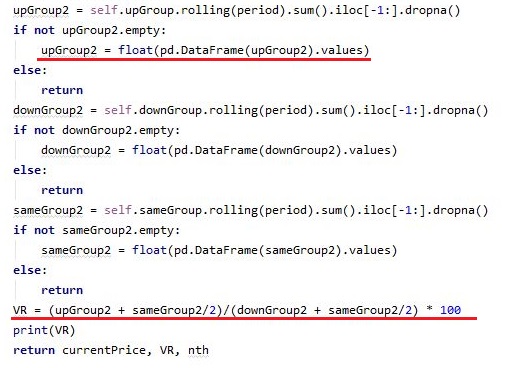 그리고 나서 다음으로는 각각의 그룹 - 전일 대비 가격이 상승했으면 upGroup, 하락했으면 downGroup, 그리고 전일과 가격이 같으면 sameGroup에 거래량을 집어 넣도록 해서, 일단 합계를 구하도록 합니다. 그리고 나서 VR을 구하기 위한 공식에 집어 넣어서 계산을 하도록 합니다.