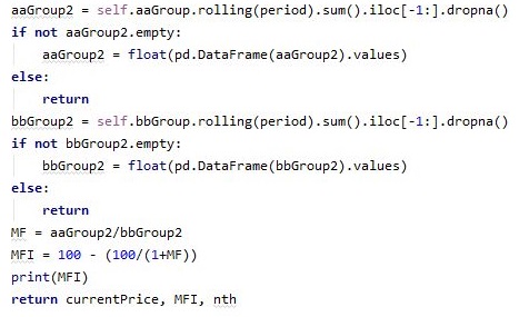이렇게 해서 일정한 기간의 aaGroup과 bbGroup가 모였으면, 계산을 해서 합계를 구하는데, 그 합계를 가지고서 일단 MF라는 값을 구하고, 그 값을 바탕으로 MFI계수를 구하도록 만들어 줍니다. 일단 여기서 이제 MFI계수까지 계산을 하는데 성공했는데, 나머지 작업은 이어서 올라오는 포스팅에서 다루도록 하겠습니다.