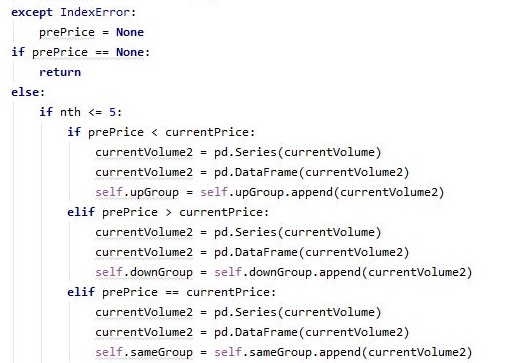 그리고 나서 위 스크린샷처럼 일단 VR을 계산하기 위해서 우선 이전 가격을 가지고 와야 하는데, 문제는 처음으로 들어오면, 당연히 이게 없습니다. 그래서 try except문을 사용하도록 하고, 일단 임시로 값을 지정해 주도록 합니다. 그리고 나서 다음으로는 판다스 데이터 프레임에 데이터를 집어 넣는다고 애를 먹었는데, 일단 먼저 판다스의 Series로 먼저 만들어 준 다음에, 그 다음에야 판다스 데이터 프레임으로 만들어 줄 수 있었습니다. 이 상태에서야 append()라는 함수의 사용이 가능했습니다.