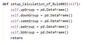 먼저 위 스크린샷처럼 처음에는 Calculation_of_Rule003만 만들려고 했습니다. 그런데 이게 하다보니, 초기에 선언해 주어야 하는 pandas의 Dataframe이 있었습니다. 어떻게 해도 빈 데이터 프레임을 생성을 안전하게 하기 위해서는 따로 메서드를 만들어서 선언해 주도록 해야 하고, 이 초기화 시키는 메서드는 다음 스크린샷에서 실행이 됩니다.