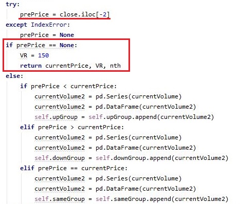 그리고 나서 다음으로는 각각의 그룹 - 전일 대비 가격이 상승했으면 upGroup, 하락했으면 downGroup, 그리고 전일과 가격이 같으면 sameGroup에 거래량을 집어 넣도록 해서, 일단 합계를 구하도록 합니다. 그리고 나서 VR을 구하기 위한 공식에 집어 넣어서 계산을 하도록 합니다.