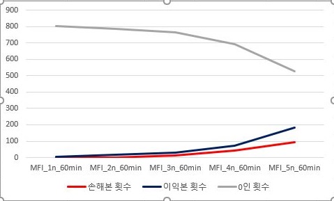 그리고 나서 최대로 본 이익의 크기와 최고로 본 손해의 크기를 한번 비교해 보았습니다. 여기서 나오는 양을 비교해 보면, 일단 널널한 조건에서는 이익과 손해의 최대치가 각각크지만, 이후엔느 너무 거래가 없어서 그 양마저 줄어드는 것이 아닌가 합니다.