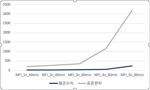 먼저 평균수익과 표준편차를 분석하는 과정을 밟아보았습니다. 일단 더 빡빡한 조건에서 여기서 일단 위 스크린샷에서 볼 수 있는 것처럼 더 빡빡한 조건일 수록 수익이 더 커지는 것을 일단 볼 수 있기는 있는데, 그 양이 미미합니다.