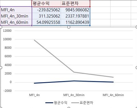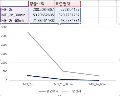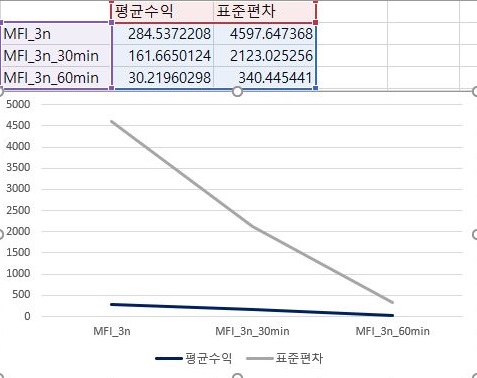 그리고 나서 다음으로 알아보는 것은 더 널널해진 조건인 3번 조건에서 평균수익과 표준편차를 알아보는 것 입니다. 일단 여기서 캔들챠트의 분봉 간격이 커지면 커질 수록 평균수익이 더 나빠지는 것을 알 수 있습니다.