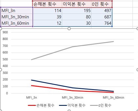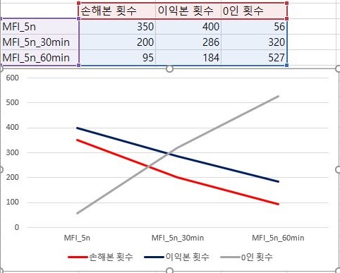 그리고 나서 다음으로 생각해야 하는 것은, 위 스크린샷에서 볼 수 있는 것처럼 일단 캔들챠트의 분봉이 커지면 커질수록 손해의 최고치는 줄어들지만, 이익도 가파르게 감소하는 것을 확인할 수 있었습니다.