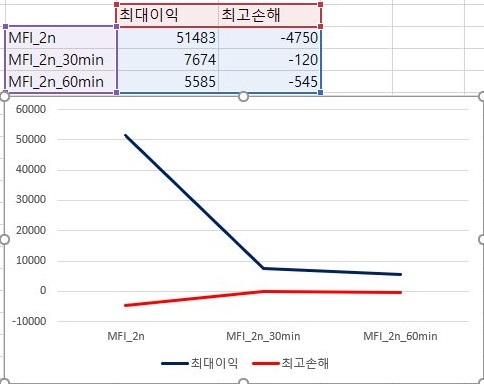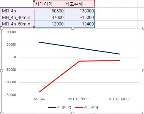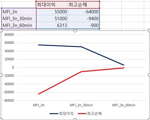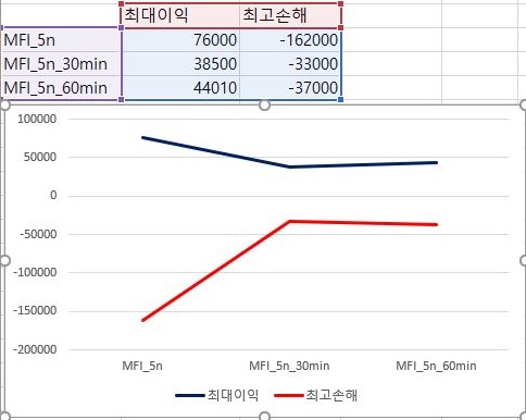 마지막으로 최대로 본 이익과 손해량을 한번 비교해 보았습니다. 이렇게 해서 비교해 보았지만, 그래도 상황이 특별히 나아질 것은 없어 보입니다. 그냥 VR과 MFI지수가 40period라는 것 자체에서 그렇게 좋지 못한 결과를 보여주는 듯 합니다. 아무래도 남은 period에서 한번 초기 테스트를 해서 결과를 추가로 얻어야 할듯 합니다.