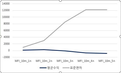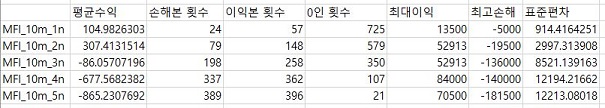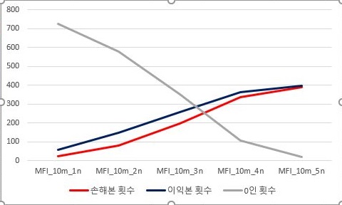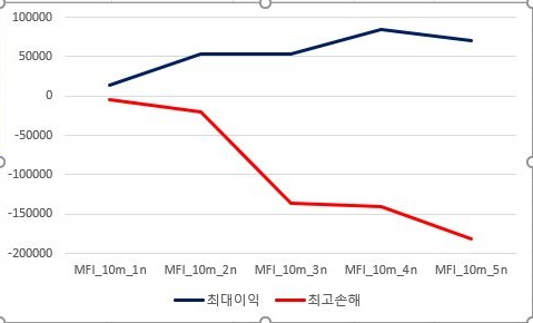 그리고 MFI에서는 10분봉 캔들챠트 데이터 베이스를 가지고서 한번 작업에 본 결과에서는 더 빡빡한 조건 중에 2번째로 빡빡한 조건에서 수익이 최대로 나오는 것을 볼 수있었습니다.