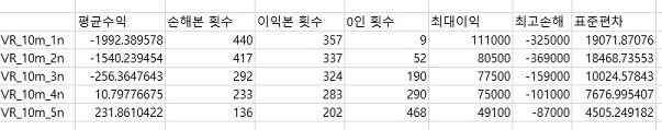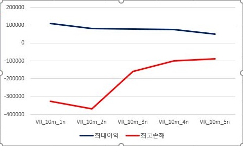 그리고 여기서도 조건이 더 빡빡해지는 1번 조건으로 가면 갈수록 이익의 최대치는 줄어들고, 손해의 최대치도 줄어드는 경향이 있는 것을 확인할 수 있었습니다. 이렇게 해서 일단 10분봉 캔들챠트에서 얻은 결과를 각각 비교해 보았는데, 아직 비교해 보지 않은 결과가 많이 있습니다.