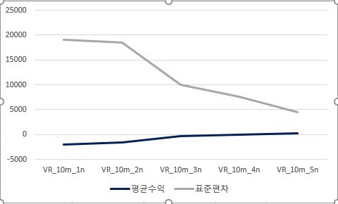 일단 여기서 평균수익과 그 수익의 표준편차를 그래프를 살펴 보았는데, 일단 더 빡빡한 조건으로 갈 수록 수익이 더 좋아는 집니다. 다만 이렇다고 해서 그 수익이 좋은 편이냐 하면, 그건 또 아니기는 합니다.