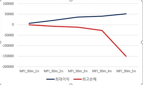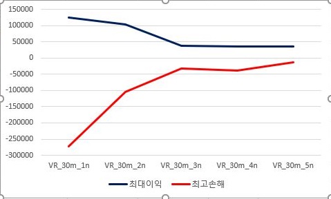 그리고 나서 위 스크린샷처럼 최대로 본 이익과 손해를 한번 비교해 보도록 했습니다. 일단 결과만을 비교해 보자면, 더 빡빡한 조건으로 가면 갈수록 손해의 최고치는 줄어드는데, 반대로 이익도 줄어드는 것을 확인할 수 있었습니다.