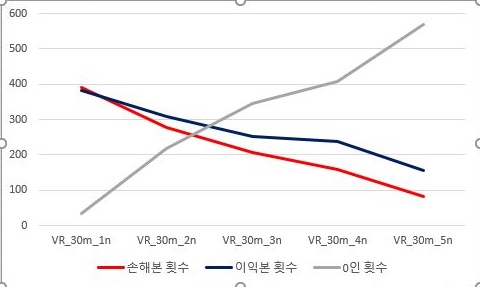 그리고 나서 다음으로는 몇개의 종목이 손해와 이익을 보았으며, 거래가 없었는지를 항번 알아보고자 합니다. 일단 이번 결과에서는 우선 가장 널널한 조건에서는 손해를 더 많이 보고 있지만, 이게 더 빡빡한 조건으로 넘어갈 수록 손해를 덜보고 있습니다. 다만 이러면서 더 많은 종목들이 거래량이 없는 상황이 이어지고 있습니다.