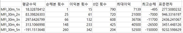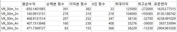 그리고 나서 위 스크린샷처럼 최대로 본 이익과 손해를 한번 비교해 보도록 했습니다. 일단 결과만을 비교해 보자면, 더 빡빡한 조건으로 가면 갈수록 손해의 최고치는 줄어드는데, 반대로 이익도 줄어드는 것을 확인할 수 있었습니다.