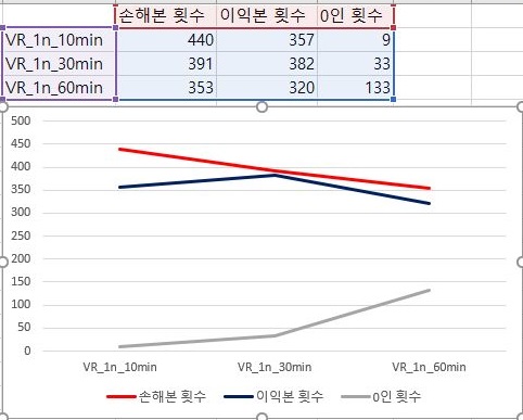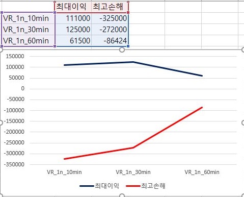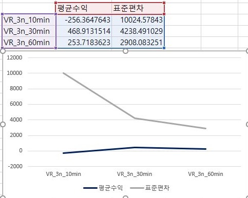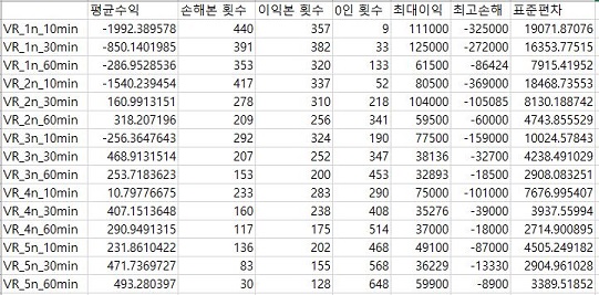 일단 가장 널널한 1번 조건에서 VR지수를 계산할 경우에는 60분봉에 가까워 질 수록 평균수익이 더 좋아는 지지만, 그렇다고 해도 모두 마이너스를 기록하고 있습니다.