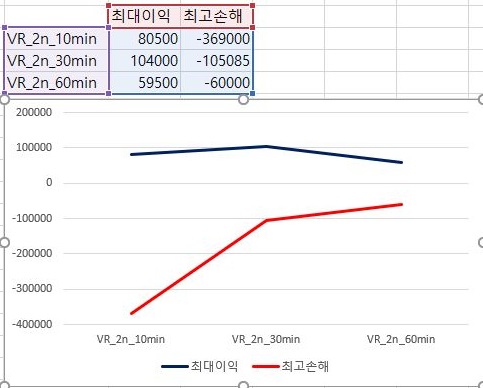 그리고 이익의 최대치는 역시 60분봉이 가장 낮지만, 그래도 손해의 최대치가 줄어드는 정도가 가장 큽니다. 이 효과로 인해서 평균수익이 60분봉에서 가장 나아보인느 이유가 아닌가 합니다.