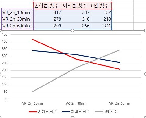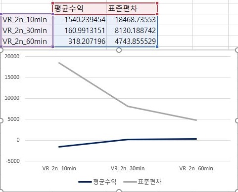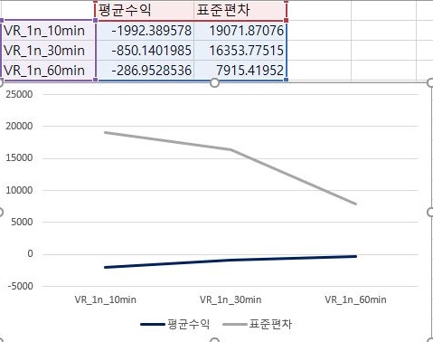 일단 가장 널널한 1번 조건에서 VR지수를 계산할 경우에는 60분봉에 가까워 질 수록 평균수익이 더 좋아는 지지만, 그렇다고 해도 모두 마이너스를 기록하고 있습니다.