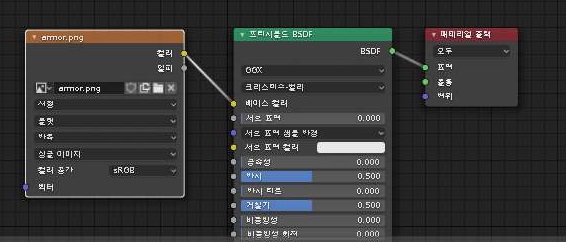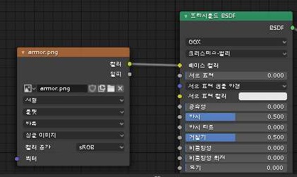 일단 위 스크린샷처럼 기존에 하는 것처럼 이미지 텍스쳐를 추가한 다음에, 여기다가 칼라를 베이스 컬러로 연결시켜 주도록 합니다.