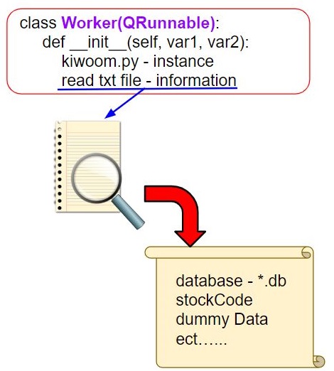 그렇게 하고 나서 이제 오전 9시를 넘어서 주식 시장이 시작되게 되면, 먼저 실질적인 거래를 하게 되는 Worker라는 스레드가 데이터 베이스를 읽어서 정보를 얻은 다음에, 키움증권 서버에 요청을 해서 현재의 주가나 거래량등을 가지고 오게 됩니다.