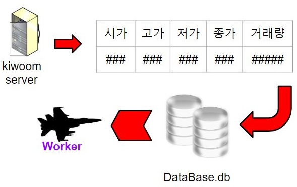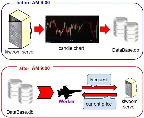 그렇게 하고 나서 이제 오전 9시를 넘어서 주식 시장이 시작되게 되면, 먼저 실질적인 거래를 하게 되는 Worker라는 스레드가 데이터 베이스를 읽어서 정보를 얻은 다음에, 키움증권 서버에 요청을 해서 현재의 주가나 거래량등을 가지고 오게 됩니다.