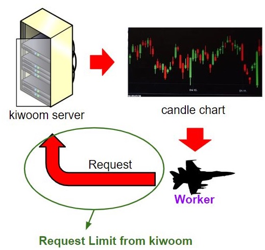 그래서 왜 이런 식으로 작업을 하느냐, 그냥 함재기에 해당하는 Worker클래스에서 키움증권에서 데이터를 그때 그때 요청하면 되지 않느냐 하실 거라면, 여기서 문제가 있습니다. 일단 키움증권 서버에서 일일히 캔들챠트 - 주식정보를 요청해서 가지고 올 수 있지만, 제가 한개의 종목만이 아니라 20개가 넘는 종목을 한꺼번에 보고 있기 때문에 발생하는 문제가 있습니다.