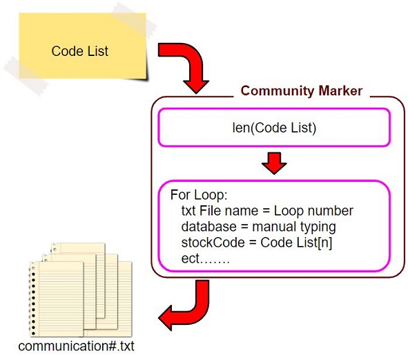 그래서 이 txt파일은 어떻게 작성을 하느냐 하면, 여기서 먼저 코드 리스트를 확보해 놓아야 합니다. 그리고 나서 이 코드리스트 - 이것도 텍스트 파일인데, 이 파일을 ㅇ리단 communityMarker라는 새로운 py파일에 만들어 놓은 다른 프로그램을 따로 실행시켜서, 여기서 각각의 번호에 대응이 되는 txt파일이 생성이 되게 됩니다. 다시한번 말하지만, 텍스트 파일을 생성하는 것은 어디까지나 다른 py파일에서 작업을 한 것 입니다.