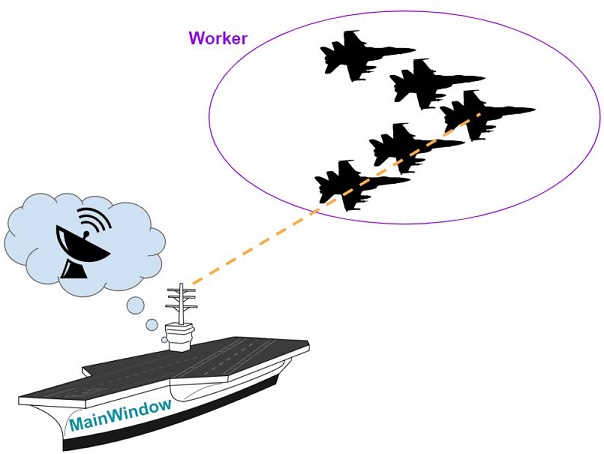 그런데 여기서 중대한 문제점이 발생했습니다. 지금은 어느정도 힌트가 잡힌 감이 있기는 있어도, 문제는 이 프로그램을 만들 당시에는 제가 각각의 스레드라고 할 수 있는 저 전투기 - 함재기에다가 명령을 전달해야 하는데, 항공모함인 MainWindow에서 Worker사이에 데이터를 주고 받는 기술을 몰랐습니다.