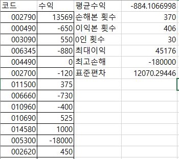 이렇게 해서 나온 결과를 먼저 위 스크린샷에서 나오는 것처럼 수익평균과 그 표준편차를 계산해 보았습니다. 그런데 그 결과를 한번 보니까, 모두 다 마이너스 - 평균적으로 손해만 보는 경악스러운 상황이 나왔습니다.