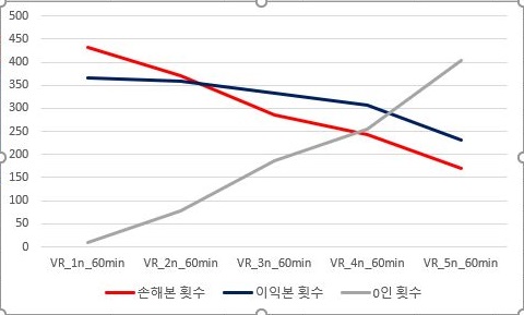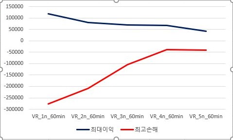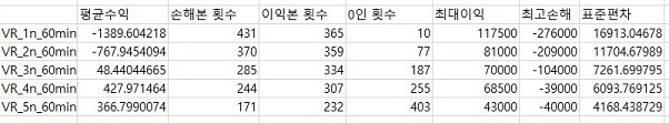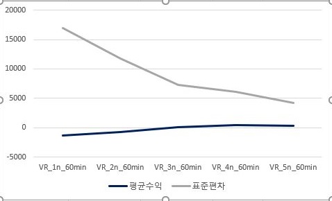 마지막으로 60분봉 캔들챠트에서 나온 결과만이 있었기에, 이 결과를 가지고서 한번 VR지수를 계산한 다음, 그 결과를 각각의 조건별로 도표로 만들어 보았습니다.