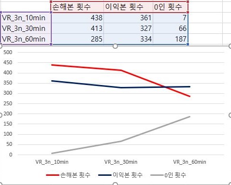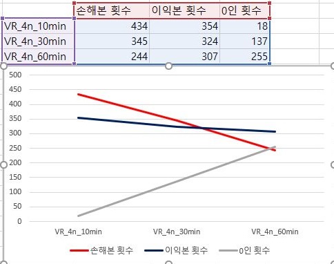 그리고 나서 한번 이익과 손해를 본 종목의 갯수를 한번 비교해 보았습니다. 일단 여기서는 손해를 이익보다 더 많이 보다가 60분봉에 와서야 겨우 상황이 나아진 것을 확인할 수 있었습니다.