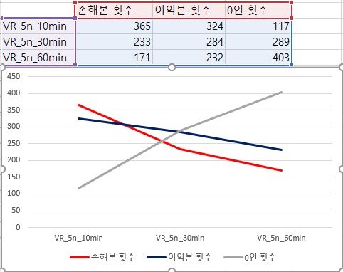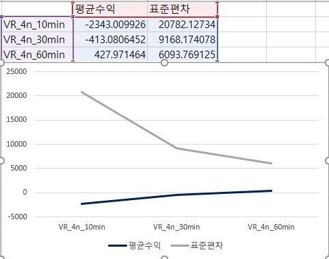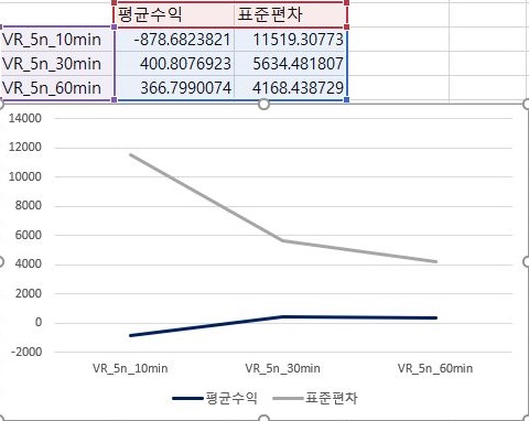 이제 마지막으로 VR지수에서 가장 빡빡하고 엄격한 조건에서 한번 작업을 한 결과를 보고자 합니다. 일단 여기서는 10분봉만 손해를 평균적으로 보았고, 나머지에서는 이익이지만, 그래도 그 양이 미미합니다.
