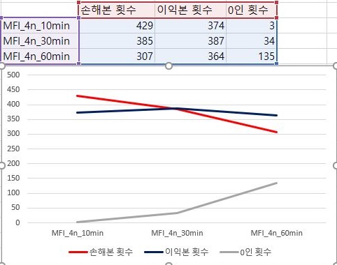 먼저 위 스크린샷에서 볼 수 있는 것처럼 일단 손해를 본 횟수와 이익을 본 종목의 갯수를 한번 비교해 보았습니다. 점점 60분봉으로 가면 갈수록 손해보는 종목의 갯수가 줄어서 이익본 종목의 갯수와 더 차이가 나오는 것을 확인할 수 있는데, 문제는 거래가 전혀 없는 종목 역시 늘어난다는 것 입니다.