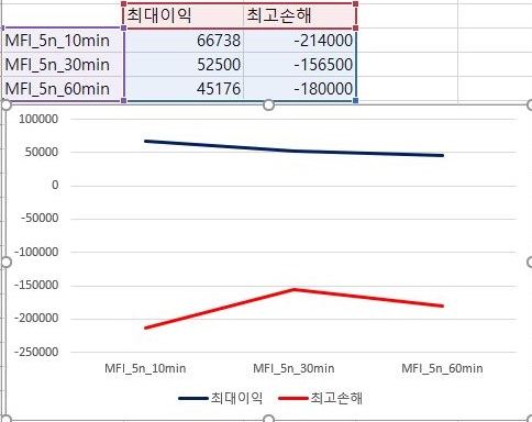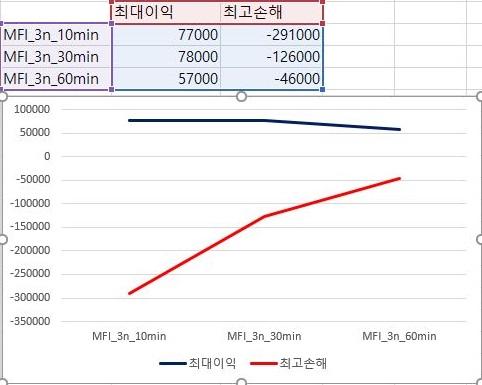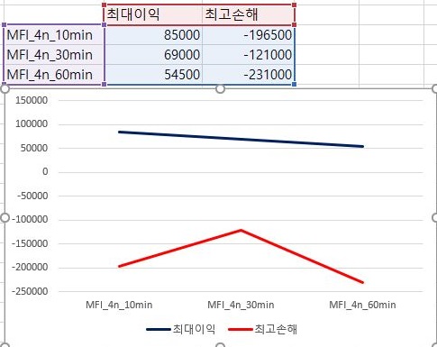 먼저 위 스크린샷에서 볼 수 있는 것처럼 일단 이익의 최대치는 그렇게 캔들챠트 데이터 베이스의 변화에 따른 변화량이 없는데, 손해의 최고치는 60분봉으로 가면 갈수록 서서히 줄어드는 것을 확인할 수 있었습니다.