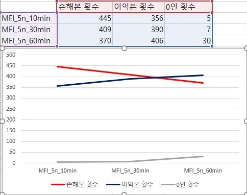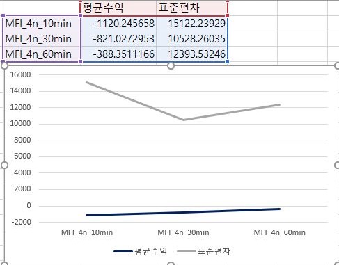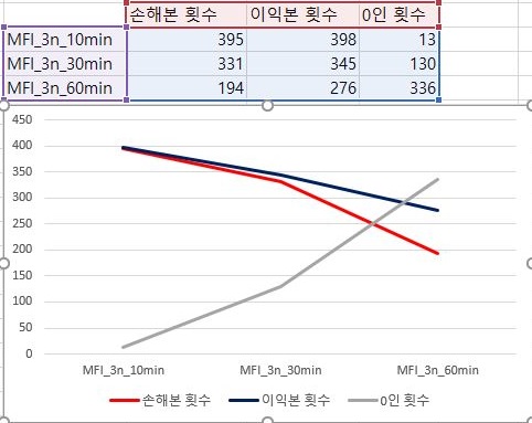 마지막으로 일단 최대 이익과 최소 이익을 비교해 보았는데, 여기서도 그렇게 좋지 못한 결과가 나왔습니다. 일단 이렇게 해서 특별한 경향성이 없는 것을 알 수 있었는데, 이래서 생각해 보면, MFI를 쓰는 경우도 이익을 볼 경우보다 손해를 볼 확률이 훨씬 더 높다는 것을 알 수 있었습니다. 이제 마지막으로 전체적인 VR과 MFI를 이용한 내용을 분석해 보아야 겠다는 생각이 듭니다.