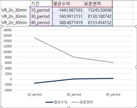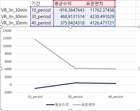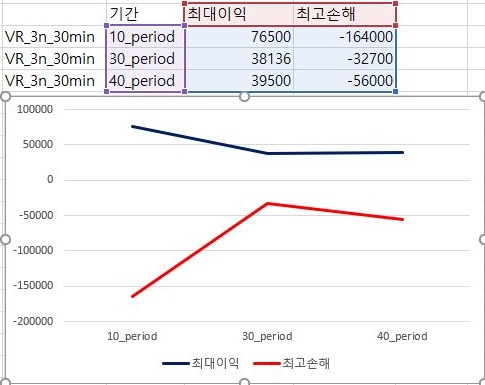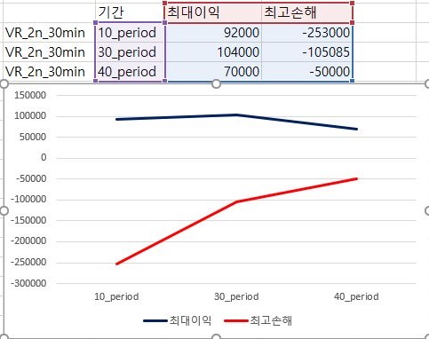 그리고 나서 다음으로는 이익과 손해의 최대치에 대해서 한번 알아보고자 합니다. 일단 그렇게 이익의 최대치는 그렇게 변하지는 않지만, 손해의 최대치는 가면 갈수록 줄어드는 경향을 보이고 있습니다. 결국 여기서는 period를 늘리는 것이 조금은 더 나아는 보입니다.