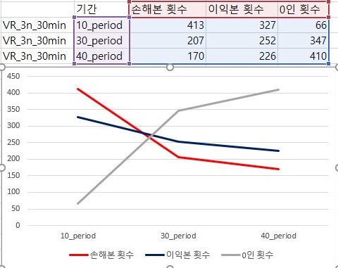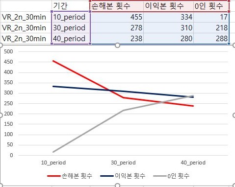 그리고 나서 다음으로 볼 수 있는 것처럼 최고의 이익량과 손해량을 한번 비교해보면, 일단 30period까지는 이익은 변하지 않고, 40period에 들어가면, 손해의 최대치는 좀 줄어들지만, 이익의 최대치도 줄어드는 현상을 볼 수 있습니다.