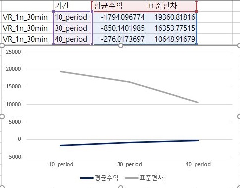 그리고 나서 다음으로는 이익과 손해의 최대치에 대해서 한번 알아보고자 합니다. 일단 그렇게 이익의 최대치는 그렇게 변하지는 않지만, 손해의 최대치는 가면 갈수록 줄어드는 경향을 보이고 있습니다. 결국 여기서는 period를 늘리는 것이 조금은 더 나아는 보입니다.