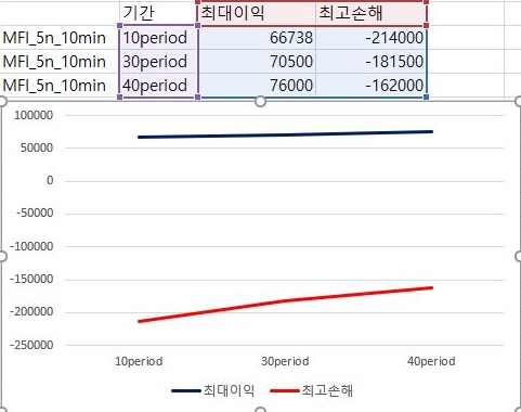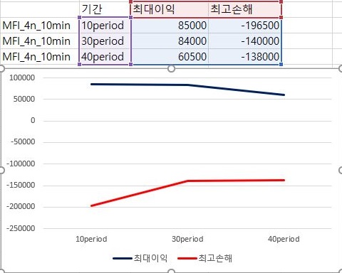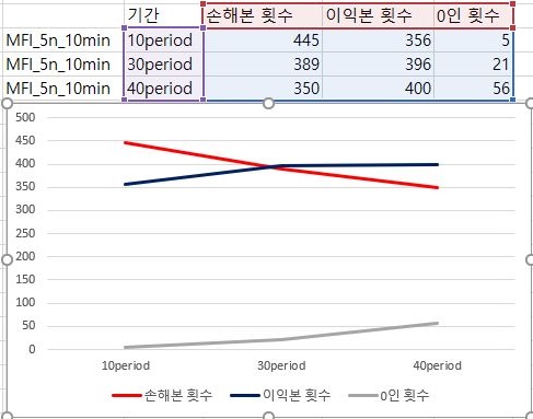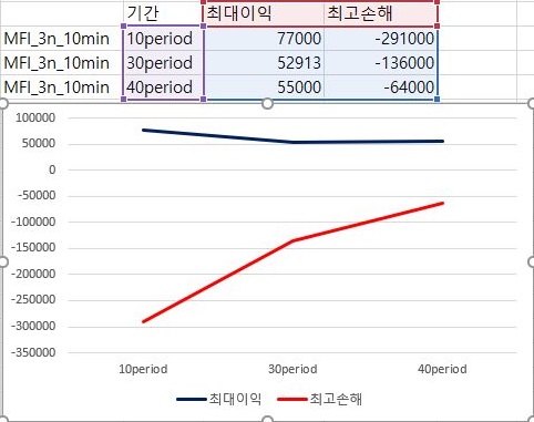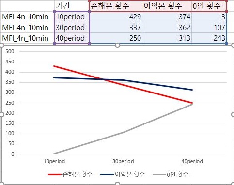 그리고나서 위 스크린샷의 그래프처럼 이익과 손해의 최고량을 비교해보니, 일단 이익의 최대치는 그렇게 변하지 않았는데, 손해의 최대치도 그렇게 변하지 않는 것도 관측이 되었습니다. 일단 30period에서 어느정도 줄어들고서는 그 이후에는 그렇게 줄어들지 않았습니다.