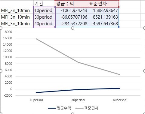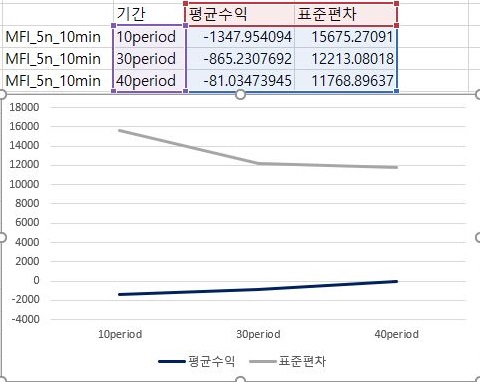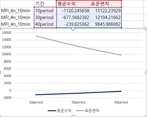 먼저 3번 조건에서 평균수익과 표준편차에 대해서 한번 이야기를 해 보아야 합니다. 우선 10period에서와 30period에서는 수익이 영 아니지만, 40period에 와서 상황이 나아지는 것을 확인할 수 있었습니다.