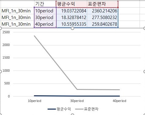 그리고 나서 다음으로 해야 할일은 위 스크린샷에서 볼 수 있는 것처럼 중간에 위치하고 있다고 할 수 있는 3번째 조건에 대해서 한번 작업을 해 보도록 했습니다. 여기서도 그렇게 크게 변하는 경향은 없지만, 일단 앞서 소개한 조건과는 다르게 30period에서 평균수익이 더 증가했다가 그 이후에 약간 감소하는 것을 보여주고는 있습니다.