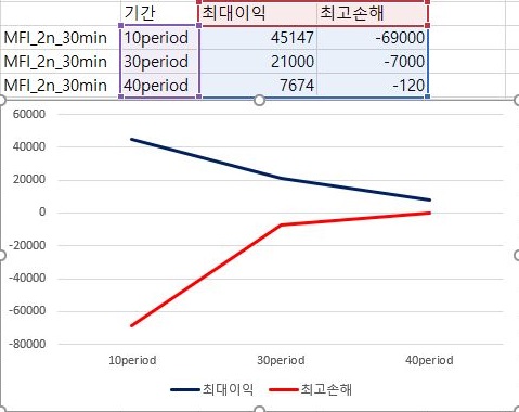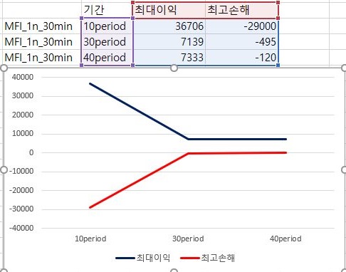 이제 이러고 나서 이익과 손해의 최대치를 한번 비교해 보았습니다. 일단 여기서는 period가 늘어나면 늘어날 수록 점점 최대의 이익량과 손해량이 동시에 줄어드는 마찬가지인 현상을 볼 수 있었습니다.