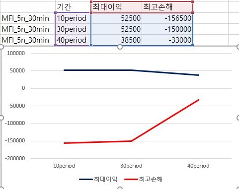 3번 조건에서 일단 위 스크린샷과 같이 나온 이익의 최대치와 손해의 최고치를 한번 비교해 보았더니, 여기서도 그렇게 크게 특이점이 있는 결과는 확보할 수 없었습니다.