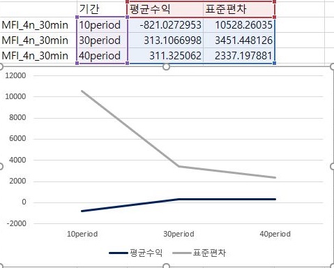 그리고 나서 다음으로 볼 수 있는 것이, 일단 4번 조건이라고 2번째로 널널한 조건에서 나온 겨로가를 분석해 보려고 일단 평균수익과 표준편차에 대해서 그래프를 그렸습니다. 여기서도 period가 길어지면 길어질 수록 더 수익이 잘 나오는 것을 확인할 수 있었습니다.