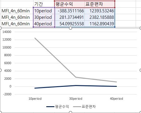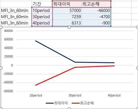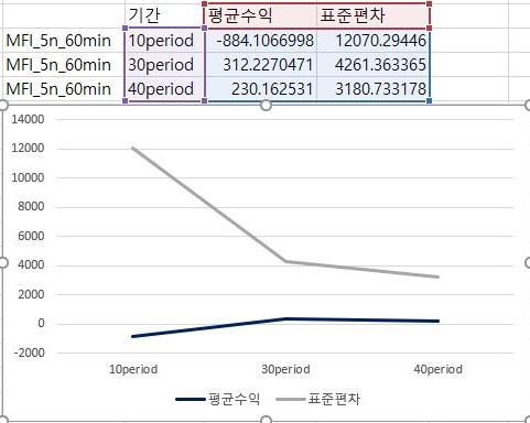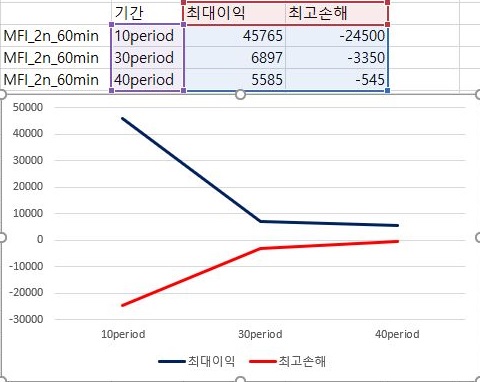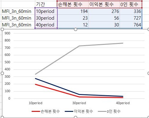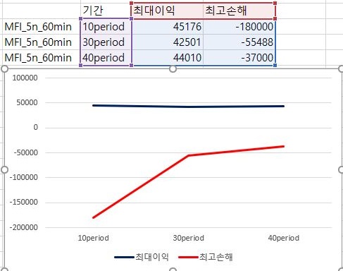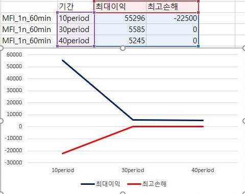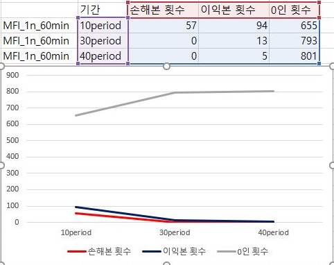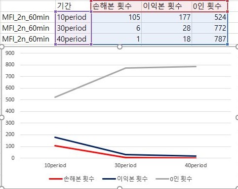 마지막으로 이익과 손해의 최대치에 대해서 한번 비교를 해 보아야 합니다. 여기서 나오는 것을 가지고서 한번 작업을 해보고자 하면, 이익의 최대치는 거의 변하지 않으면서 손해는 period가 줄어들면서 꾸준히 줄어드는 경향을 보이고 있다는 것을 알 수 있습니다. 다만, 이렇다고 해서 MFI를 기반으로 해서 나온 매도/매수 룰을 사용할 수 있느냐 하면, 그건 아니라는 생각이 아직은 듭니다. 결국 VR과 MFI를 이용해서 해본 초기 테스트 결과는 그렇게 좋다고 할 수 없어 보입니다.
